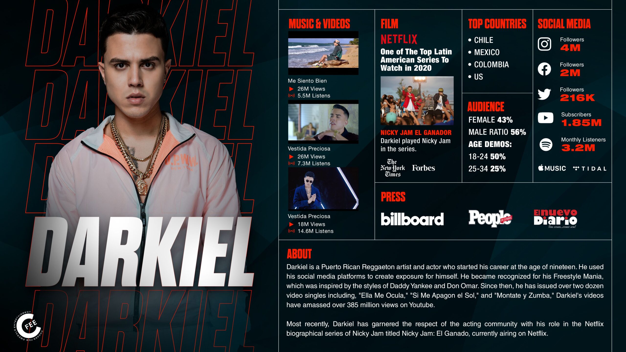 Darkiel, cantante, compositor y actor puertorriqueno se une la propuesta de “Chosen Few Emerald Entertainment”, una compañía de entretenimiento dedicada a crear, producir, y administrar música y películas innovadoras en el espacio musical urbano latino; que abarca una lista diversa de proyectos de múltiples talentos que resuenan e influyen en la cultura y con un mensaje que edifica y que a través de esta letra puede bendecir a otras personas.