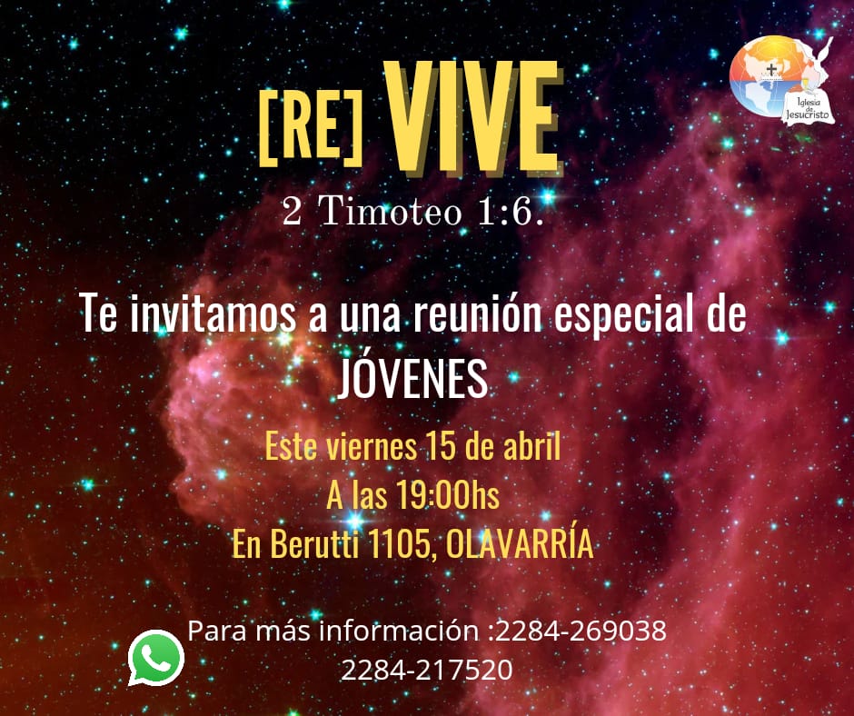 Todo está pensado para poder realizarse este próximo viernes 15 de abril, donde los jóvenes de distintas congregaciones estarán acercándose a Berutti 1105 para poder participar de un evento que tiene como nombre RE VIVE, lema que está acompañado por el versículo que se encuentra en 2 de Timoteo 1:6.